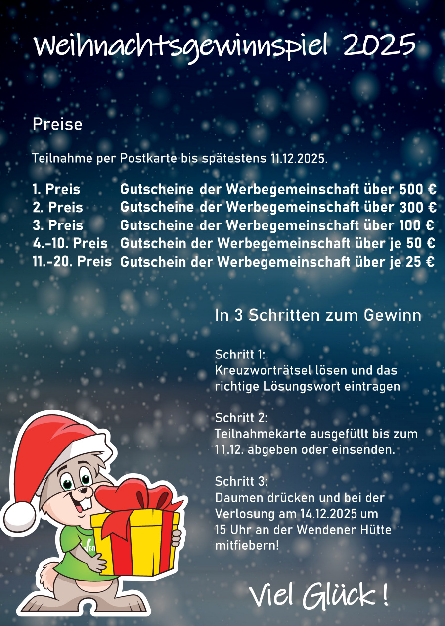 Das alljährliche Weihnachtsgewinnspiel der Werbegemeinschaft Wenden geht in die nächste Runde. Die Teilnahmekarten gibt es wie immer bei unseren Mitgliedsbetrieben im Wendener Land. Einfach das Kreuzworträtsel lösen und die Teilnahmekarte rechtzeitig bei uns abgeben - schon sind Sie dabei!